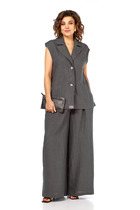 В мире моды всегда есть место для универсального и стильного наряда, и этот женский костюм больших размеров станет настоящей находкой для каждой женщины. Данный женский комплект подходит как для повседневной носки и работы, так и для торжественных событий. Костюм выполнен из материала средней плотности, что гарантирует комфорт и долговечность. Жакет женский имеет удлинённый силуэт с ассиметричным низом, распашной конструкцией и застежкой на петли-пуговицы. Спинка с центральным швом, а рукав втачной одношовный, что делает изделие практичным. Изюминкой этого жакета больших размеров становится настрочный карман-книжка, а также съемный пояс на застежке-карабине, который гармонично подчеркивает талию. Брюки женские с широкими штанинами (палаццо) обладают стильными карманами в боковых швах и притачным поясом на резинке, что добавляет комфорта в повседневной носке. Этот костюм легко комбинируется с различными топами и джемперами, позволяя создать уникальный и стильный образ для любого случая. Не упустите возможность добавить этот универсальный костюм в свой гардероб – он станет вашим верным спутником и в повседневной жизни, и на праздниках! Длина жакета повседневного составляет 79 см, а длина рукава от плечевого шва – 50 см. Длина брюк больших размеров по боковому шву – 113 см, что делает его удобным для роста до 170 см.