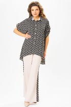 Стильный комплект, состоит из бомбера, майки и брюк. Майка выполнена из вискозы, хорошо тянется и приятная к телу. Горловина округлой формы, окантована, рукав укороченный. Бомбер выполнен из летней ткани, льна-вишера, имеет приятную фактуру, комфортен в ношении. Горловина округлой формы, на обтачке, застежка на кнопки, лиф изделия с отрезной кокеткой, декорированной бусинами. Также на полочке обработаны прорезные карманы с листочкой. Спинка свободного покроя, по низу изделие обработано планкой с резинкой. Рукав втачной, длинный, по низу на манжете, с декором в виде паты, застегивается на кнопку. Брюки-палаццо выполнены из льна-вишера, с застежкой на молнию, верхний срез обработан притачным поясом, с застежкой на пуговицу. На передних полотнищах обработаны карманы в боковых швах, по верху заложены односторонние складки. На заднем полотнище брюк обработаны вытачки, низ с широкой подгибкой. Стильный комплект с эффектным декором и фурнитурой, отличный выбор для летнего гардероба!