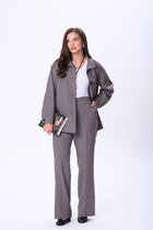 Комплект женский трехпредметный, затмит вашим образом. Жакет на подкладке с центральной застежкой на 1 петлю и пуговицу с асимметричным воротником и контрастной отделкой. По переду функциональные карманы. Спинка с рельефом выходящим из плеча и средним швом. Рукав втачной двухшовный с контрастной манжетой. Блузка с округлым вырезом горловины и спущенной линией плеча. Брюки классические средней посадки  с боковыми карманами. Пояс с резинкой по бокам. Длина жакета 70 см, Длина рукава 58см. Длина брюк 102  см.