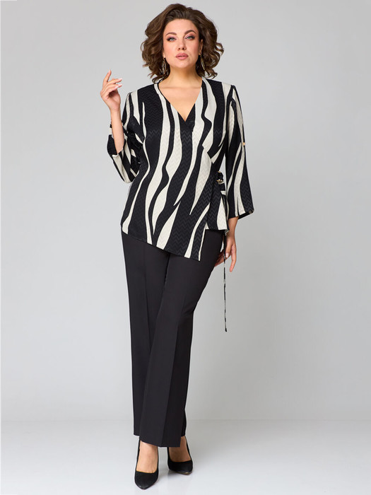 Комплект женский 2-ух предметный  состоящий из  туники и брюк.Туника полуприлегающего силуэта на запах из вискозной ткани. V-образный вырез горловины, красиво подчеркивает линию  декольте. По переду застрочена нагрудная вытачка. Спина цельнокроеная. Рукав втачной одношовный с патой, с помощью которой можно регулировать длину рукава. Брюки прямого силуэта на притачном поясе, с посадкой на талии, с застежкой на тесьму- молнию и  1 петлю и 1 пуговицу,  с боковыми наклонными карманами на передних половинках брюк . По передним и задним половинкам брюк заутюжены стрелки. Для лучшего прилегания брюк в области талии в поясе со стороны спинки вставлена резинка.