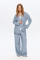 Блузка полуприлегающего силуэта выполнена из шифона «травки». Округлый вырез горловины. По переду настрочен нагрудный карман обманка листочка с 1 пуговицей. Спинка со средним швом и талевыми вытачками. Рукав втачной, одношовный на притачной манжете, застежка на 1 пуговицу и петлю . Застежка центральная 5 пуговиц и петель. Юбка с завышенной талией заужена к низу на обтачке выполнена. По переднему полотнищу юбки настрочена карман «листочка». Сзади разрез и застежка на потайную тесьму-молнию. Юбка на подкладке.