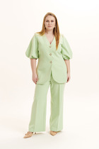Костюм женский, состоящий из блузы и брюк. Блуза прямого силуэта, с разрезами по бокам. Рукав цельнокроеный, заканчивается притачной манжетой. Горловина V-образная с притачной планкой по линии переда, спинки и рукава. Головина на завязке. Дополнением служит пояс. Брюки по силуэту с легким клешем от колена, по передним половинкам по центру застрочен защип. Карманы боковые накладные. Брюки с застежкой на молнию. Притачной пояс застегивается на петлю-пуговицу и с резинками по бокам. Модель без подкладки.