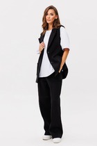 Юбка, зауженная к низу, на обтачке. Перёд с талевыми вытачками и центральным швом, который заканчивается разрезом. По заднему полотнищу талевые вытачки, центральный шов и застёжкой на потайную тесьму-молнию. От выточек до бокового шва вставлены резинки. Юбка на тонкой трикотажной подкладке. Украшает костюм отделочные строчки. Дополняет костюм пояс с пряжкой.