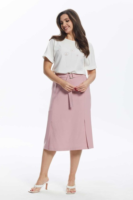 Юбка, слегка расклешённая к низу, на обтачке, без подкладки. По переду рельефы от талии до низа, заканчивающиеся шлицами с разрезом. По заднему полотнищу юбки талевые вытачки, центральный шов и застёжкой на потайную тесьму-молнию.