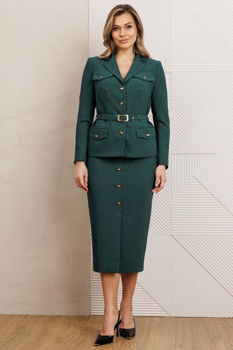 Жакет полуприлегающего силуэта с центральной застежкой на петли-пуговицы. Спинка со средним швом. По переду – талиевые вытачки, карманы с клапаном и декоративные клапаны в области груди. Воротник пиджачного типа. Рукава втачные, двухшовные. Локтевой шов заканчивается отлетной шлицей с декором из ряда пуговиц. Жакет на подкладке. Жакет дополнен съёмным поясом с пряжкой.