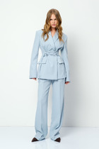 Женственный комплект в теплых тонах с ультрамодными принтами. Состоит из жакета и платья. Жакет приталенного силуэта с застежкой встык на декоративные крючки. Воротник пиджачного типа. По переду вертикальные рельефы из проймы. В области талии отрезная планка, переходящая в пояс-завязку через декоративные рамки. По низу переда и спинки фигурная баска со складками. Рукава втачные двухшовные, с манжетой по низу из отделочного материала. Платье приталенное, отрезное по линии талии. Юбка расширенная к низу. Лиф с нагрудными вытачками. Горловина круглой формы. Рукав короткий, втачной.