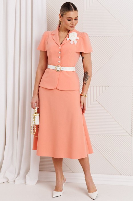 Двухпредметный комплект, состоящий из жакета и юбки. Жакет полуприлегающего силуэта, отрезной по линии талии. Перед и спинка с вертикальными рельефами, в которые вставлены рукава, сверху по окату со складками. Спинка со средним швом. Воротник пиджачного типа. Застежка на петли-пуговицы. Юбка А-силуэта, на притачном поясе, по бокам с резинками. Застежка на тесьму-молнию в среднем шве, который переходит в шлицу. Костюм на подкладке. Комплект декорирован съемной брошью в виде цветка.