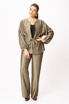 Двухпредметный костюм, состоящий из блузона и брюк. Блузон свободного кроя с отрезными бочками и ассиметричными басками по переду. Горловина переда свободная и драпируется в виду "качелей".  По баскам широкие отделочные строчки. Спинка со швом и вытачками для лучшего прилегания. Пройма свободная, в верхней части обработана планкой. По спинке в среднем шве молния, брюки свободного прямого кроя, с притачным поясом и застежкой на пуговицу и молнию. По поясу задней половинки брюк резинка. Карманы "хулиганы" по передней половинке брюк и мягкой складкой по линии талии.