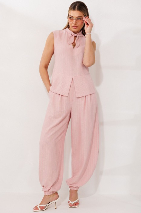 Брюки-алладины парят в воздухе. С высокой посадкой и мягкими складками от пояса по переду, они создают благородный напуск, словно шальвары. Пояс плотно сидит на талии благодаря притачному поясу со шлёвками и частичной резинке сзади — в движении брюки не сползают, но дышат вместе с вами. Спереди — объёмные карманы с отрезным бочком, куда так удобно спрятать руки или ракушку с пляжа. Главная деталь - низ, стянутый широкими манжетами с резинкой внутри; они собирают штанину в мягкое «облачко», открывая щиколотку, а вытачки на задних половинках изящно облегают фигуру, не добавляя лишнего объёма.