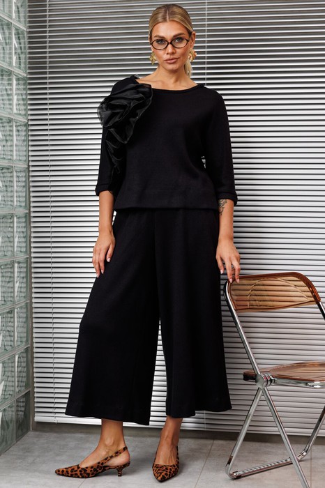 Создать нарядный образ с брюками легко! Легко это осуществить с нашей новинкой. Костюм состоит из блузы и юбки-брюк. Используемый материал тонкий, струящийся трикотаж, имеющий в составе ангору. Блуза свободного кроя, “летучая мышь”, по низу с перепадом длины. Перед декорирован акцентным дизайнерским цветком из органзы. Юбка-брюки свободного кроя с резинкой на талии.