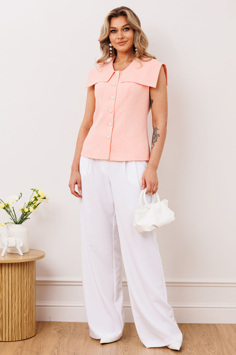 Яркий комплект: жилет с воротником "апаш" и брюки "палаццо". Этот смелый и элегантный комплект сочетаем в себе дерзость и женственность, создавая образ, который невозможно игнорировать. Жилет приталенного силуэта с центральной застежкой на петли пуговицы. Вертикальные рельефы. Главная акцентная деталь - шикроий воротник "апаш". Спинка с центральным швом и рельефами. Брюки "палаццо" создают воздушный силуэт. Высокая талия визуально удлиняем ноги. Брюки на притачном поясе, с двумя складками по переду. Боковые карманы. Сзади резинка. Молния в среднем шве. Жилет на подкладке.
