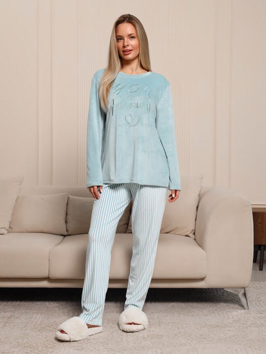 Костюм из трикотажного полотна «вельмонд двухсторонний » в комбинации двух видов: гладкокрашеного и с рисунком в узкую полоску в единой цветовой гамме, состоящий из джемпера и брюк. Джемпер – из гладкокрашеного полотна, с длинными втачными рукавами, горловиной овальной формы, обработанной втачной планкой из основного материала, разрезами в боковых швах и вышивкой на полочке. Брюки – длинные, прямые, с эластичной тесьмой по линии талии.
