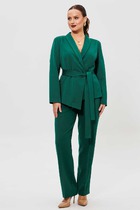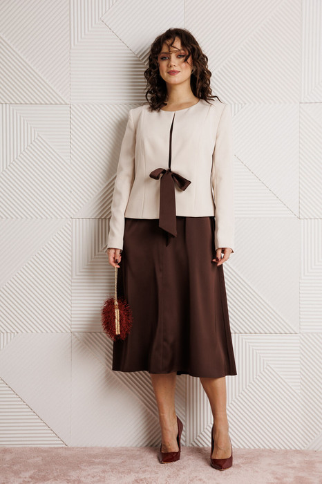 Жакет полуприлегающего силуэта, выполнен из костюмной ткани (тянется), на подкладке с центральной застежкой на завязки. По переду рельефные швы, горловина округлой формы. По спинке средний шов и талиевые вытачки. Рукава втачные, двухшовные. Жакет с плечевыми накладками.