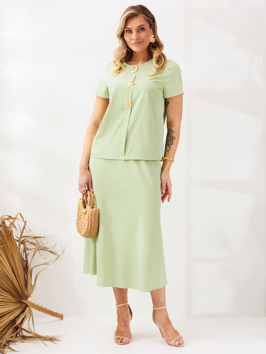 Юбка расширенная к низу. Верхний срез оформлен поясом с эластичной резинкой. Юбка без подкладки.