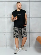 Костюм мужской, состоящий из футболки и брюк. Футболка однотонная с принтом на груди; модель свободная, со спущенной линией плеч, овальным вырезом горловины. Брюки из полотна с набивным рисунком эксклюзивного дизайна, прямые, с боковыми карманами с обтачными входами, на притачном поясе с отстроченной эластичной тесьмой.