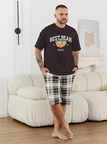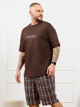 Костюм мужской, состоящий из футболки и брюк. Футболка однотонная с принтом на груди; модель свободная, со спущенной линией плеч, овальным вырезом горловины. Брюки из полотна с набивным рисунком эксклюзивного дизайна, прямые, с боковыми карманами с обтачными входами, на притачном поясе с отстроченной эластичной тесьмой.
