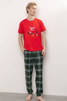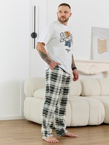 Костюм мужской, состоящий из футболки и шорт. Футболка однотонная с принтом на груди; модель свободная, со спущенной линией плеч, овальным вырезом горловины. Шорты из полотна с набивным рисунком эксклюзивного дизайна, с боковыми карманами с обтачными входами, на притачном поясе с отстроченной эластичной тесьмой.