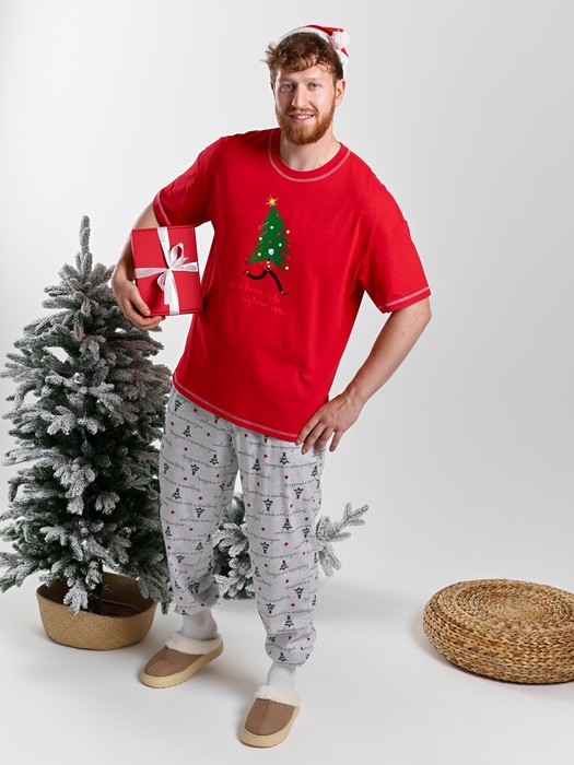 Костюм мужской из трикотажного полотна "кулирка" в комбинации двух видов: гладкокрашенного красного цвета и с набивным тематическим рисунком на сером фоне , состоящий из футболки и брюк. Футболка - классического силуэта, свободного покроя, с приспущенным плечом, с втачными рукавами длиной до локтя, горловиной овальной формы, обработанной втачной планкой и принтом в центре переда. По шву втачивания планки настрочена декоративная (5-ниточная) отделочная строчка нитками контрастного цвета Подгибка низа рукавов и изделия так же выполнена с применением декоративной отделочной строчки. Брюки выполнены из полотна с набивным тематическим рисунком, длинные, умеренной ширины, прямые, на притачном поясе с эластичной тесьмй внутри и карманами в боковых швах.