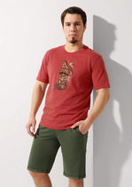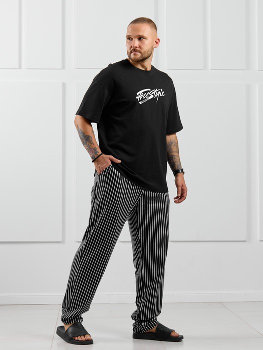 Костюм мужской, состоящий из футболки и брюк. Футболка однотонная с принтом на груди; модель свободная, со спущенной линией плеч. Брюки из полотна с набивным рисунком в узкую черно-белую полоску, прямые, с боковыми карманами с обтачными входами, на притачном поясе с отстроченной эластичной тесьмой.