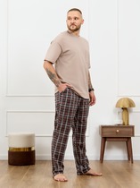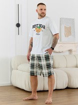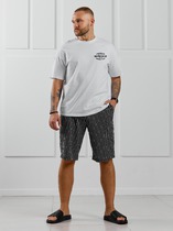 Костюм мужской, состоящий из футболки и шорт. Футболка однотонная с принтом на груди; модель свободная, со спущенной линией плеч. Шорты из полотна с набивным рисунком в узкую черно-белую полоску, с боковыми карманами с обтачными входами, на притачном поясе с отстроченной эластичной тесьмой.