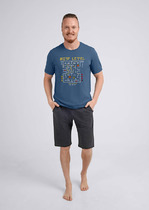 Костюм мужской, состоящий из футболки и шорт. Футболка однотонная с принтом на груди; модель свободная, со спущенной линией плеч, втачными рукавами, овальным вырезом горловины. Шорты из полотна с набивным рисунком эксклюзивного дизайна, с боковыми карманами с обтачными входами, на притачном поясе с отстроченной эластичной тесьмой.