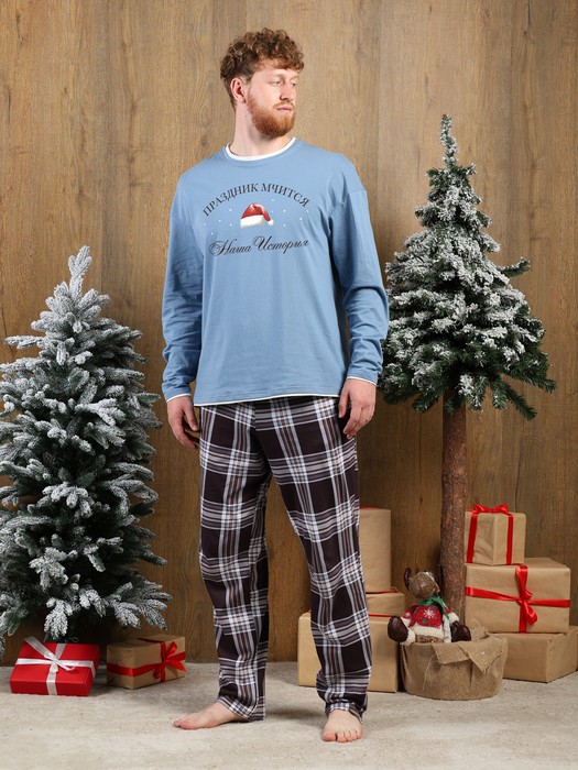 Костюм мужской из трикотажного полотна "кулирка" в комбинации двух видов: гладкокрашенного и с рисунком в крупную клетку, сочетающихся между собой по цвету, состоящий из джемпера и брюк. Джемпер - из гладкокрашеного полотна, свободного покроя, с длинными втачными рукавами и приспущенными плечами, с горловиной овальной формы и тематическим принтом, выполненным в технике шелкографии. Горловина, нижние срезы рукавов и низ изделия обработаны подгибкой с отделочным широким кантом контрастного цвета. Брюки - из полотна в клетку, свободного покроя, прямые, на притачном поясе с эластичной тесьмой внутри, с карманами в боковых швах. Нижние срезы обработаны подгибкой.