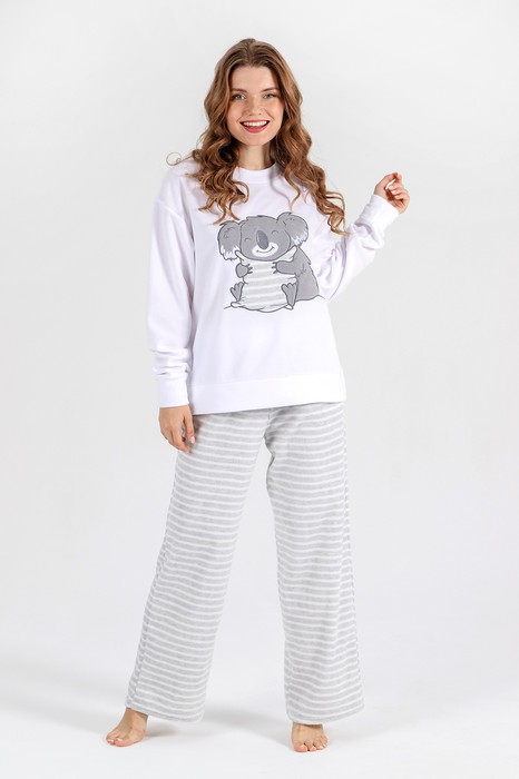 Костюм молодежный из трикотажного полотна «флис» в комбинации двух видов гладкокрашенного и с рисунком в полоску, состоящий из джемпера и брюк.