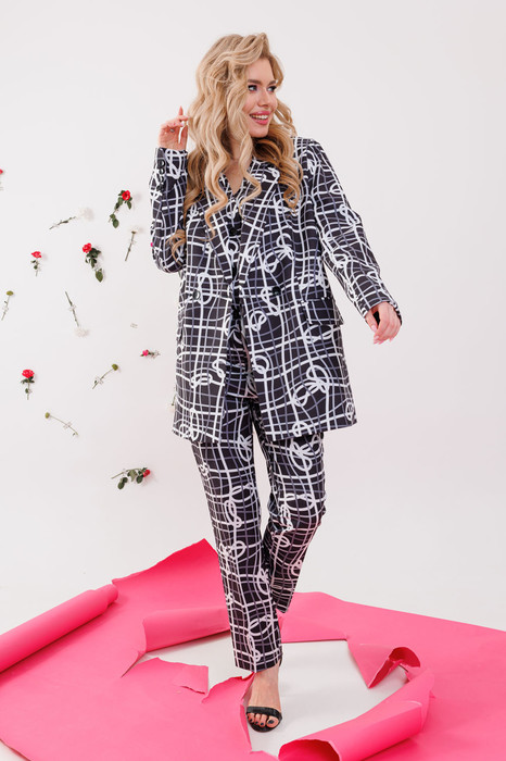 Обворожительный костюм-тройка: жакет, жилет и брюки. Жилет полуприлегающего силуэта, на подкладке. По переду рельефа карманы "листочки", застёжка на петли-пуговицы. По спинке вытачки и хлястик. Длина изделия 50 см. Жакет прямого силуэта. По переду нагрудная вытачка, переходящая в прорезной карман с клапаном. Двухбортная застёжка на петли-пуговицы. Рукав двухшовный, на логтевом шве отлетная шлица. Длина рукава 63 см. Длина изделия 77 см. Брюки полуприлегающего силуэта,зауженные к низу. По переду боковой карман, застежка на тесьму-молнию и пуговицу. Длина брюк 99 см.
