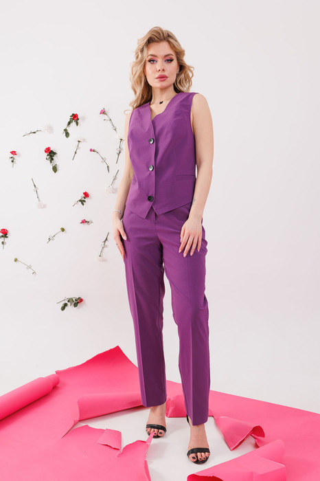 Костюм двухпредметный: жилет и брюки. Жилет полуприлегающего силуэта, на подкладке. По переду рельефа карманы "листочки", застёжка на петли-пуговицы. По спинке вытачки и хлястик. Длина изделия 50 см. Брюки полуприлегающего силуэта,зауженные к низу. По переду боковой карман, застежка на тесьму-молнию и пуговицу. Длина брюк 99 см.