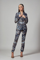 Костюм из трикотажного гофре двухпредметный: состоит из блузы и брюк. Блуза свободного кроя Рукав втачной три четверти, планка по горловине. Вырез круглый. Элегантные брюки из плиссированного трикотажа свободного кроя, верхний срез собран на резинку. От бёдер максимально расклешенные, создают имитацию юбки.