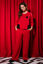 Оригинальный костюм двухпредметный: состоит из блузы и брюк. Блуза прямого свободного кроя с округлым вырезом горловины с декоративной нашивкой. По переду две отлетные складки в рельефе. Рукава втачные длиной три четверти. По низу изделия притачной волан из трикотажного гофре. Брюки со стрелкой свободного кроя, верхний срез представлен широкой резинкой, с карманами.