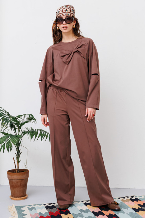 Костюм двухпредметный: состоит из джемпера и брюк. Джемпер свободного силуэта с округлой горловиной. Рукав комбинированного кроя, с передними и задними швами. Верхняя и нижняя часть рукава образуют между собой разрез. Карманы в боковых швах. По переду изделие декорировано фигурным бантом. Брюки со стрелкой свободного кроя, верхний срез представлен широкой резинкой, с карманами.