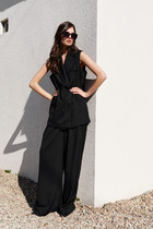 Костюм двухпредметный: состоит из джемпера и брюк. Джемпер из комбинированной ткани  свободного силуэта с округлой горловиной. Рукав с передними и задними швами. Верхняя и нижняя часть рукава образуют между собой разрез. Карманы в боковых швах. Брюки прямого силуэта большого объёма. Линия талии занижена. Пояс притачной. На передних половинках брюк карманы с отрезным бочком. На задних половинках брюк отрезная кокетка и накладные карманы.