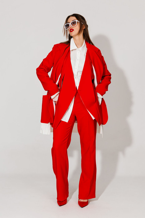 Костюм трехпредметный: состоит из жилета, брюк и жакета. Жилет двубортный прямого кроя объёма оверсайз. Застёжка фигурная на петли и пуговицы. Карманы - листочки. Жакет прямого силуэта на подкладке. Спинка со средним швом. На полочке нагрудная вытачка переведена в прорезной карман с клапаном и листочкой. Линия плеч расширена. Рукава втачные, длинные, двухшовные. Воротник отложной, пиджачного типа на отрезной стойке. Однобортная застежка на петли и пуговицы. Отделочные детали из трикотажного гофре по низу рукава и самого изделия создают имитацию рубашки. Брюки прямого кроя, с карманами.По переду боковой карман, застежка на тесьму-молнию и пуговицу. По спинке верхний срез  представлен резинкой. Галстук не входит в комплект.