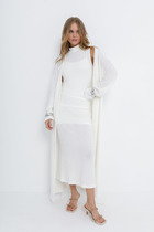 Костюм двухпредметный: состоит из джемпера и юбки. Уютный джемпер с округлой горловиной. Защипы на рукаве-реглане делают образ максимально женственным и элегантным. На рукавах есть съёмные авторские украшения в виде цветка из основной ткани. Юбка - солнце макси с узким поясом. В боковых швах расположены карманы. Застёжка на петлю и пуговицу и молнию по спинке.