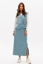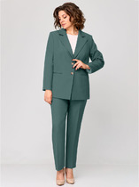 Костюм двухпредметный: состоит из джемпера и юбки. Уютный джемпер с округлой горловиной. Защипы на рукаве-реглане делают образ максимально женственным и элегантным. На рукавах есть съёмные авторские украшения в виде цветка из основной ткани. Юбка - солнце макси с узким поясом. В боковых швах расположены карманы. Застёжка на петлю и пуговицу и молнию по спинке.
