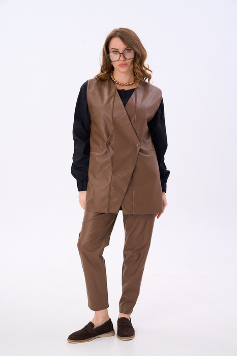 Костюм двухпредметный: состоит из жилета, брюк. Жилет двубортный прямого кроя объёма оверсайз. Застёжка фигурная на кнопки. Карманы - листочки. Брюки с притачным поясом и с карманами в боковых швах.