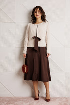 Костюм двухпредметный: состоит из жакета и брюк. Жакет рубашечного типа прямого силуэта с асимметричным низом. Рукав втачной со спущенной линией плеча, фиксируется на пату. Застежка центральная на петли и пуговицы, смещённая по косой. На левой полочке накладной карман с клапаном. Воротник отложной на стойке до половины спинки. Комфортные брюки свободного кроя со складками и карманами по переду, зауженные к низу. Пояс притачной со шлёвками и центральной застёжкой на гульфик и молнию. По спинке изделия накладные карманы и резинка.
