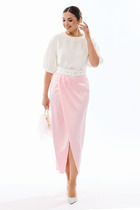 Костюм двухпредметный: состоит из жакета и брюк. Жакет рубашечного типа прямого силуэта с асимметричным низом. Рукав втачной со спущенной линией плеча, фиксируется на пату. Застежка центральная на петли и пуговицы, смещённая по косой. На левой полочке накладной карман с клапаном. Воротник отложной на стойке до половины спинки. Брюки свободного кроя из гладкой ткани сочетают элегантность и комфорт. Широкая резинка на поясе и наличие функциональных карманов подчеркивают удобство модели.