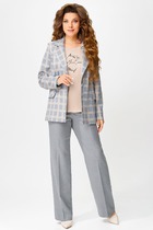 Костюм комбинированный двухпредметный: состоит из жакета и брюк. Жакет рубашечного типа прямого силуэта с асимметричным низом. Рукав втачной со спущенной линией плеча, фиксируется на пату. Застежка центральная на петли и пуговицы, смещённая по косой. На левой полочке накладной карман с клапаном. Воротник отложной на стойке до половины спинки. Брюки свободного кроя из гладкой ткани сочетают элегантность и комфорт. Широкая резинка на поясе и наличие функциональных карманов подчеркивают удобство модели.