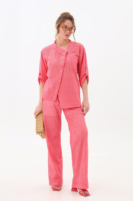 Костюм двухпредметный: состоит из жакета и брюк.Жакет рубашечного типа прямого силуэта с асимметричным низом. Рукав втачной со спущенной линией плеча, фиксируется на пату. Застежка центральная на петли и пуговицы, смещённая по косой. На левой полочке накладной карман с клапаном. Воротник отложной на стойке до половины спинки. Брюки свободного кроя, верхний срез представлен широкой резинкой, с карманами.