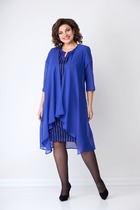 Костюм двухпредметный: состоит из жакета и юбки. Жакет прямого силуэта, воротник пиджачного типа, рукав одношовный, втачной с незначительно спущенной линией плеча, длиной три четверти, с патой. По линии ткани настрачная кулиса с завязками из основной ткани. Застежка центрально-бортовая. Линия низа верхней части фигурная ассиметричная. Юбка - солнце макси с узким поясом на резинке.