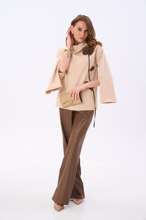 Костюм двухпредметный: состоит из джемпера и брюк. Джемпер-кейп прямого свободного силуэта. Горловина с цельнокроеным воротником-стойкой. Рукав втачной широкий, от линии локтя до запястья есть дополнительное отверстие для рук. Декорирован цветком из контрастной ткани. Брюки свободного кроя, верхний срез представлен широкой резинкой, с карманами.