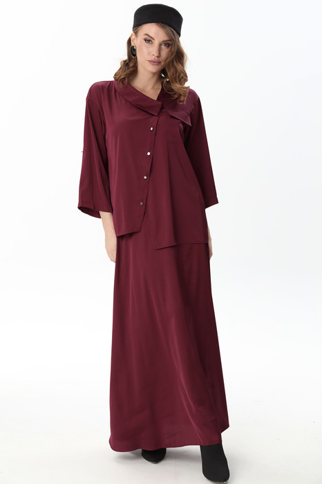 Костюм комбинированный двухпредметный: состоит из жакета и юбки. Жакет рубашечного типа прямого силуэта с асимметричным низом. Рукав втачной со спущенной линией плеча, фиксируется на пату. Застежка центральная на петли и пуговицы, смещённая по косой. На левой полочке накладной карман с клапаном. Воротник отложной на стойке до половины спинки. Юбка - солнце макси с узким поясом. В боковых швах расположены карманы. Застёжка на петлю и пуговицу и молнию по спинке.