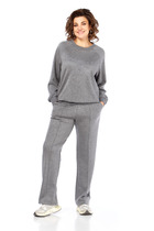 Костюм двухпредметный: состоит из жакета и брюк. Жакет прямого силуэта, воротник пиджачного типа, рукав одношовный, втачной с незначительно спущенной линией плеча, длинный, с притачной манжетой, декорированной разрезом. По линии ткани настрачная кулиса с завязками из основной ткани. Застежка центрально-бортовая. Линия низа верхней части фигурная ассиметричная. Брюки свободного кроя, верхний срез представлен широкой резинкой, с карманами.
