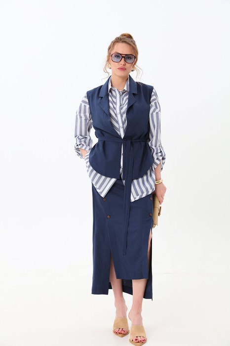 Костюм трёхпредметный: состоит из рубашки, жилета и юбки. Рубашка прямого силуэта с притачной планкой с застёжкой на петли и пуговицы. Рукав втачной одношовный со спущенной линией плеча с патой. Воротник рубашечный стояче-отложной. Перед состоит из трёх частей : центральная часть ,верхняя часть и нижняя часть. Спинка состоит из двух частей . Линия низа фигурная с широкой окантовкой. Жилет съёмный прямого силуэта без застёжки, воротник пиджачного типа. Линия низа фигурная, в комплект идёт пояс из основной ткани. Юбка длиной миди, расклешенная к низу, с асимметричным низом. Пояс притачной, по спинке собран на резинку. Переднее полотнище состоит из трех частей. Правая часть скреплена отделочной строчкой и кнопками. В боковых швах изделия расположены карманы. По спинке изделия идёт средний шов и две вытачки для удачной посадки по фигуре. Юбка без подкладки.