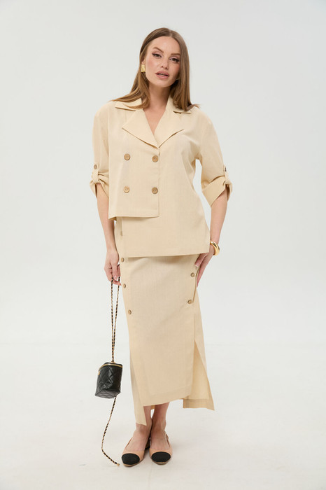 Костюм двухпредметный: состоит из жакета и юбки. Жакет прямого силуэта с имитацией центральной застёжки на пуговицы. Рукав втачной одношовный, длиной три четверти,застегивающийся на пату. Воротник пиджачного типа . Линия низа фигурная, симметричная . Юбка длиной миди, расклешенная к низу, с асимметричным низом. Пояс притачной, по спинке собран на резинку. Переднее полотнище состоит из трех частей. Правая часть скреплена отделочной строчкой и кнопками. В боковых швах изделия расположены карманы. По спинке изделия идёт средний шов и две вытачки для удачной посадки по фигуре. Юбка без подкладки.