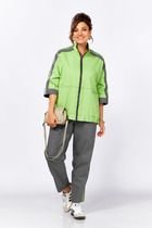 Костюм двухпредметный: состоит из жакета и брюк. Жакет прямого силуэта, воротник пиджачного типа, рукав одношовный, втачной с незначительно спущенной линией плеча, длиной три четверти, с патой. По линии ткани настрачная кулиса с завязками из основной ткани. Застежка центрально-бортовая. Линия низа верхней части фигурная ассиметричная. Брюки свободного кроя, верхний срез представлен широкой резинкой, с карманами. По центру правой брючины расположена планка с функционирующими петлями и пуговицами.