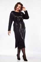 Костюм двухпредметный: состоит из жакета и юбки. Жакет рубашечного типа прямого силуэта с асимметричным низом. Рукав втачной со спущенной линией плеча, фиксируется на пату. Застежка фигурная на петли и пуговицы, смещённая по косой. Воротник рубашечный. Юбка - солнце макси с узким поясом. В боковых швах расположены карманы. Застёжка на петлю и пуговицу и молнию по спинке.