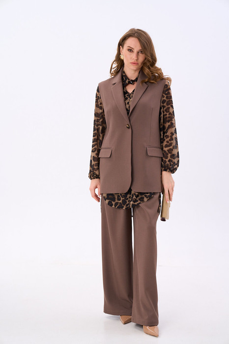 Костюм двухпредметный: состоит из жилета и брюк. Жилет однобортный прямого силуэта с застежкой на петлю и пуговицу. Воротник стояче-отложной с отрезной стойкой с лацканами.Изделие с отрезным бочком. Перед с талиевыми вытачками, с прорезными карманами в рамку с клапанами. Край борта со скруглением по низу. Спинка со средним швом, в котором обработана шлица. Изделие на подкладке.Элегантные брюки прямого кроя с боковыми карманами с отрезным бочком. Застежка на молнию и пуговицу. По переду - складки. Задние половинки с талиевыми вытачками и прорезными карманами с листочкой. Верхний срез обработан притачным поясом, по спинке собран на резинку. Низ обработан швом в подгибку.